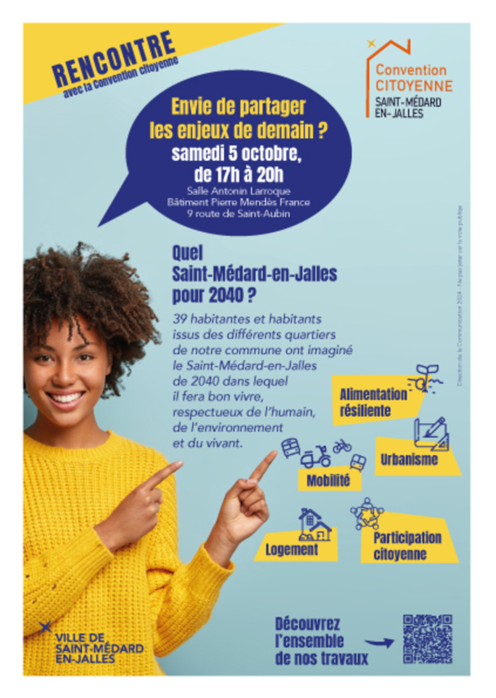 Les membres de la Convention vous invitent à découvrir et à échanger sur leur vision du « Saint-Médard-en-Jalles 2040 » le samedi 5 octobre à 17h, dans le bâtiment Pierre Mendès France.